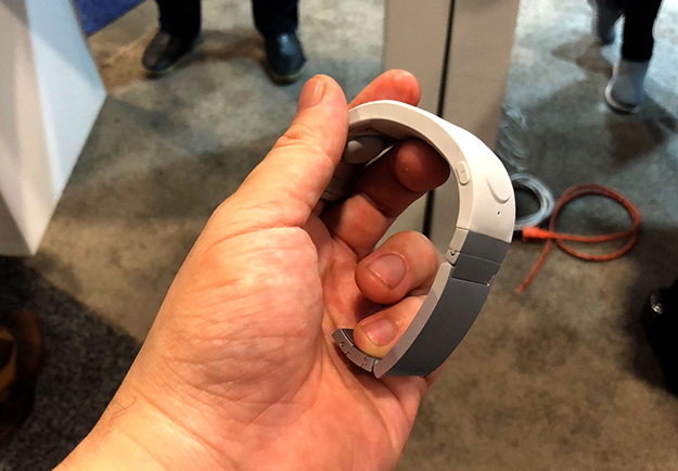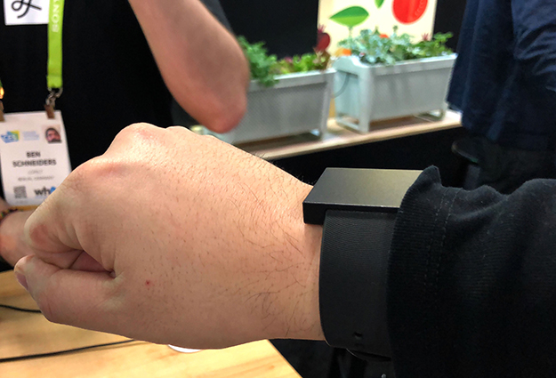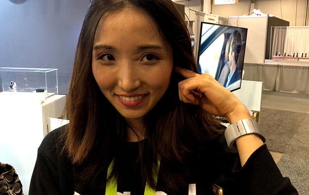 「sgnl」は、とても凄いが、とても変なプロダクトだ。一言でいうと、指を耳に突っ込んで音を聴く「指イヤホン」である。写真で係の女性が実演しているように、骨伝導ではない「体伝導(と係の方が言っていた)」スピーカーになっているリストバンドを巻いて指を耳にぐいっと突っ込む。かなり深く突っ込む。
