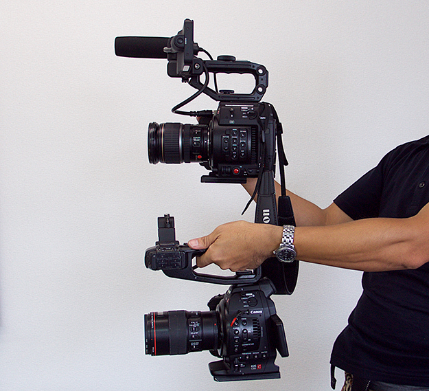 私は、ドキュメンタリー撮影時に、約6割はハンドヘルドで撮影している。その際、手ぶれ補正対策を2段階で行っている。IS付きのレンズの使用が1つ目で、2つ目は汎用のφ15mmロッドを組み合わせたL型の簡単な胸当てを装着し、ストラップを首から掛けて撮影する3点支持だ(左手をレンズに添えるので、厳密には4点か…)。