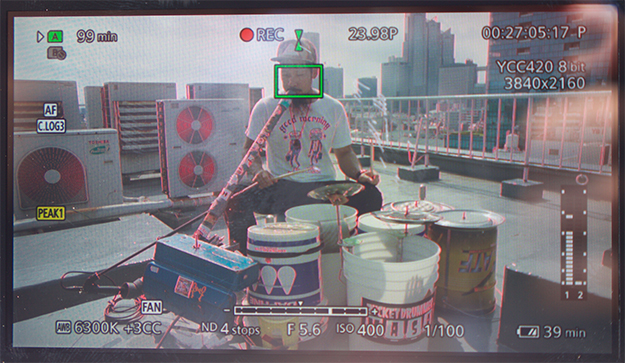 今回は限られた時間でのテストとなったため、普段行っているドキュメンタリー撮影に近い内容の撮影を心がけた。たまたまこの日、映像プラットフォームVookのコンセプトムービー撮影が行われていたので、バケツドラム奏者の演奏シーンを撮影させて頂いた。