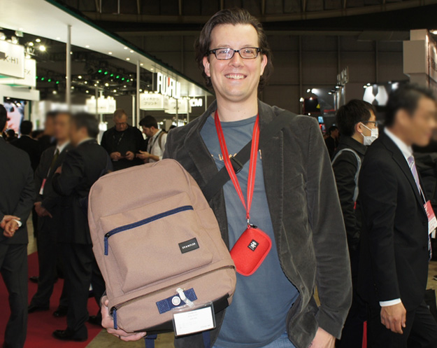 Crumplerダブルラックスを手に笑顔で対応していただいたCrumpler ukのCEO