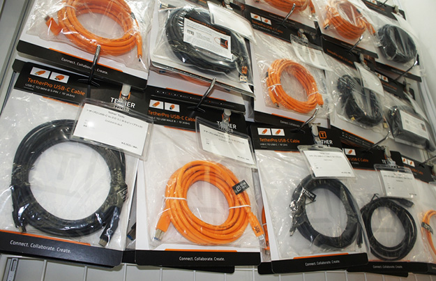 TETHER TOOLSの各種変換ケーブル。USB3.0やテザープロUSB C、マイクロBなどがあり、コネクター部分がL字形状になっているものもあるので、機器に接続したときにコネクター部に負担がかからないようにできる