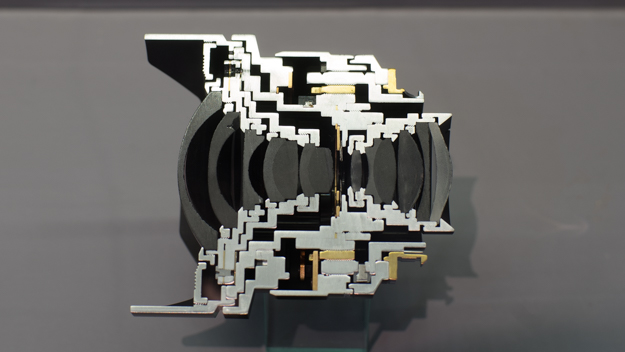 普段ではみることができない製品カットモデルも目を引く展示となっていた。特にカットモデルはかっこよさを見るのではなく、カットモデルの断面を見てほしいのとことだ。コシナの交換レンズはアルミと真鍮で製造されおり、カットした断面はそれらの材質の色に光っている。他社製の交換レンズは鏡胴に樹脂を使ったり、金属と樹脂を組み合わせている製品も多い。「コシナのレンズはフルメタルで作られている」というところにぜひ注目してほしいとのことだ。
