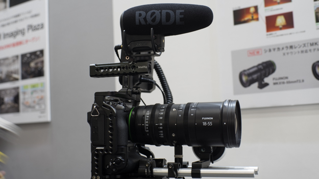 焦点距離27-84mmの標準ズームレンズで焦点距離全域でT2.9の明るさを実現する「MKX18-55mmT2.9」。レコーダーやマイクと組み合わせて展示されていた
