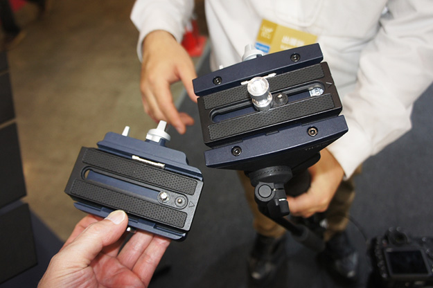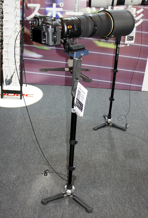 今回の新製としては、今年発表したハンズフリーモノポッドHFMPとワンタッチ着脱が可能なスマートクイックリリースアダプターAP-XがセットになったモデルHFMP AP KITを出展。HFMP AP KITに含まれるスマートクイックリリースアダプターAP-Xは、TH-Xヘッドのプレート部分の機構を流用したもので、クイックシューによりカメラの着脱か簡単に行える機構となっている。これにより、望遠レンズを装着した重装備のカメラでも簡単に一脚から着脱でき、使い勝手が向上している。