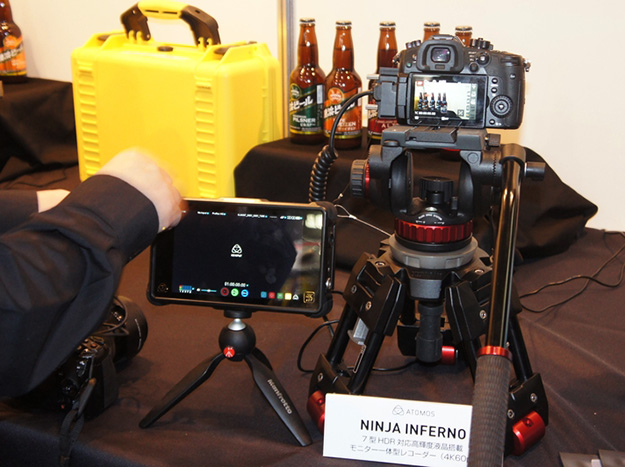 7型HDR対応高輝度LCD搭載モニター一体型レコーダーNINJA INFERNO。4K60P収録に対応している。組み合わせて展示されていたカメラはパナソニックのDC-GH5でHDMI Ver2.0対応なので60P 4:2:2 10bitの信号の出力が可能。カメラ内収録ができないフォーマットでSHOGUN INFERNOで収録