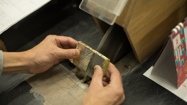 まな板状のガラスを、完成品に近い必要な大きさ(レンズの重さプラスα)に切断する。カットというよりは、熱をかけて割る感覚といってよいだろう。ガラスのバー素材は、端と真ん中では若干厚みが異なる。そのために、均等なサイズでカットをしていくと重量にばらつきがでてしまう。また、ダイヤモンドの歯を使ってカットするのが一般的だが、カッターの厚みの分だけ切りくずが発生してガラスが無駄になる。このような問題を防ぐために、材料は全て摩擦熱を用いた手切りで行われている。