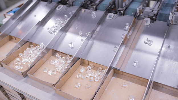 カットした硝材を重量ごとに選別する。硝材は、手切りで行っているので多少の重量のバラ付きが生まれる。そこで、自動重量選別機を使って硝材を重量ごとに選別する。