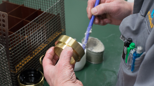 アルミの表面には、アルマイト加工を行う。酸化を防いだり、表面の硬度を上げる効果がある。真鍮の部品にも、酸化防止と表面硬度上げ削れを防ぐクロームメッキを施す。真鍮の地肌はオレンジ色だが、クロームメッキを施すことにより銀色になる。真鍮にクロームメッキが一番安定して精度よくモノづくりができる。