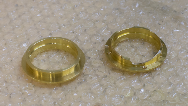 ライカマウント。真鍮の材料でできている。左はフライス加工前の状態。右は加工後