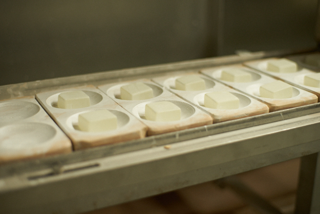 加熱炉でガラスを餅ぐらいの柔らかさまでに加熱して、金属の型で挟んでプレスを行う。ここでこれまで立方体の硝材が、プレスによってレンズの形となる。急加熱をしたガラスは時間をかけて冷まさないと割れてしまうので、別の炉に流して約1時間ほど常温まで冷やす。