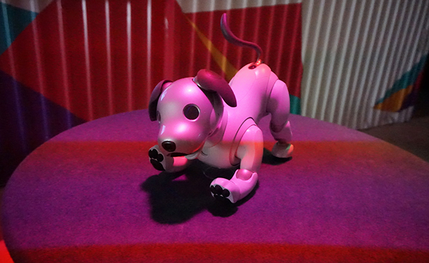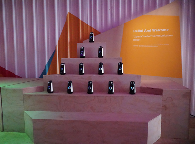 入ってすぐに出迎えてくれるのがソニーの「AI×ロボティクス」の花形であるエンタテインメントロボット“aibo”とコミュニケーションロボット「Xperia Hello!(エクスペリア ハロー)」だ。