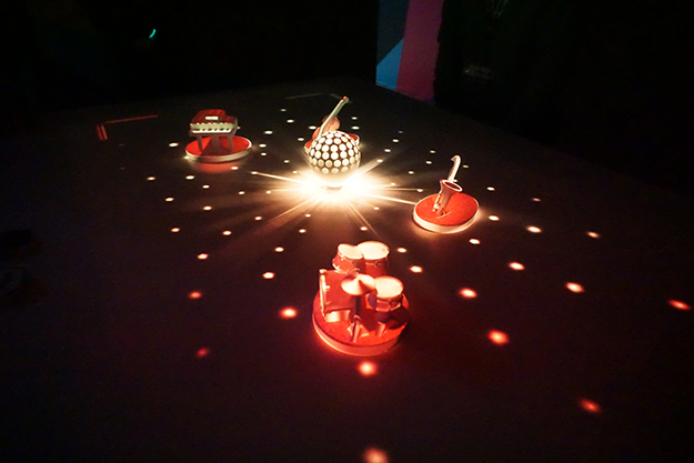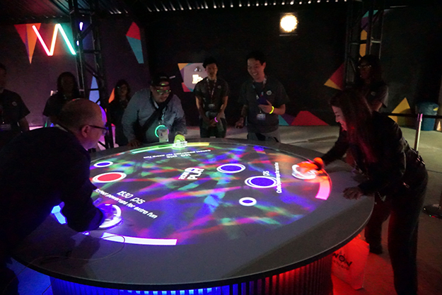 Interactive Tabletop Projector(インタラクティブテーブルトッププロジェクター)は、テーブルの上に掲げられたプロジェクターがオブジェクトを認識し、3Dインタラクティブプロジェクションマッピングを実現できる。デモでは楽器のモックアップに対してプロジェクションがあたり、しかも指先一つで音楽演奏も奏でることができるものが紹介されていた。同時に8個のタッチポイントを認識できるので複数人で同時に体験できる。ゲームはもちろん、会議などでも活用できるようになるだろう。