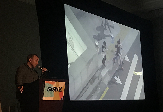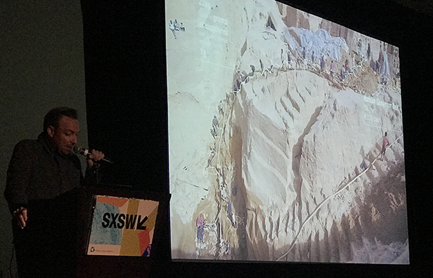 SXSW Cities Summitというトラック(都市計画やサスティナビリティ、エコについて専門的に話すカテゴリ)のクロージングパフォーマンスとして行われたのが、彼の作品「CIty Everywhere」だ。先進国から新興国まで自由自在に動き回る都市の主観映像にCGが組み合わさり、少し暗い雰囲気でストーリーが展開する。映像の中には特に解説は入っておらず、ヤング氏自らが映像に合わせてリアルタイムでナレーションをするというスタイルだ。