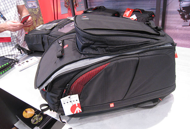 マンフロットと言えばカメラバックも優秀だ。そんな中で今回目に入ったのは中型ザック型のカメラバック。筆者もPL410サイズを持っているが、それとほぼ同じくらいの大きさの新製品を発見。中の仕切りが左右アシメトリーで使いやすそうだ。正確には測っていないが機内持ち込みも可能な大きさに見える。