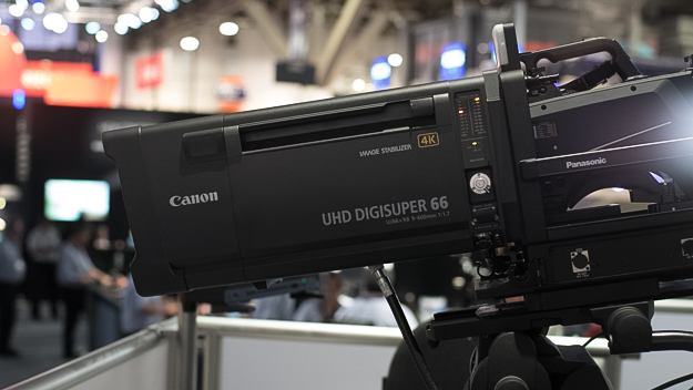 こちらも4月3日に発表されたワイド端9mmから66倍の箱型のレンズ「UHD DIGISUPER 66」が展示されていた。発売日は8月下旬を予定。ワイド9.3mmからズーム比86倍のフィールドズームレンズのフラッグシップモデル「UHD DIGISUPER 86」やワイド9mmからズーム比90倍の「UHD DIGISUPER 90」がすでに発売しているが、そこに今回発表された中望遠のフィールドレンズが加わる。UHD DIGISUPER 66は、さほど望遠が必要ないシチュエーションでの撮影をされる中継システムや、60倍クラスでも十分な放送をターゲットにしている。
