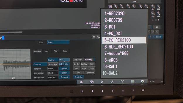 グラスバレーのEDIUSのターンキーシステムには、今後のバージョンアップでモニターのセッティングを紐付けできる機能を搭載予定。こちらの機能のデモも行われていた。例えばEDIUSでRec.709のコンテンツに切り替えた際、これまでモニターの設定は手動で切り変えて確認をする必要があった。