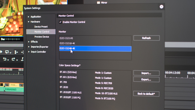 しかし、EDIUSのターンキーのシステムとCG319Xでは、EDIUSのカラー設定をRec.709に変えると自動的にCG319Xの表示がRec.709に切り替わる。この機能はEIZOがSDKをグラスバレーに提供して、グラスバレーがEDIUSの中でUSBケーブルで信号を送って切り替えを行っている。