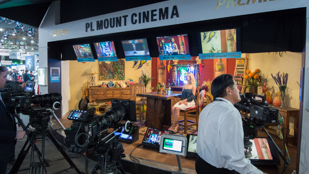 PLマウント専用の光学エクステンダーを使ったスーパー35のレンズとフルフレームのカメラを組み合わせて展示