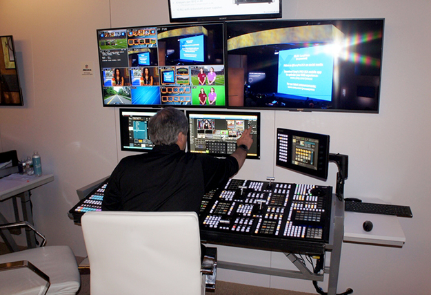ソニーブースをコントロールルーム、アトランタをデータセンターに見立てて、ソニーブースのカメラやスイッチャーサーバーの操作パネルから、アトランタに設置したプロセッサー類を操作するデモの画面