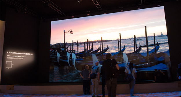今年は、放送用8K対応の3板式カメラUHC-8300や、映画制作用のCineAltaカメラVENICE、XDCAMメモリーカムコーダーなどの最新カメラシステムの展示に加え、440インチサイズのCrystal LEDディスプレイによる8K 120p映像の上映が行われた。