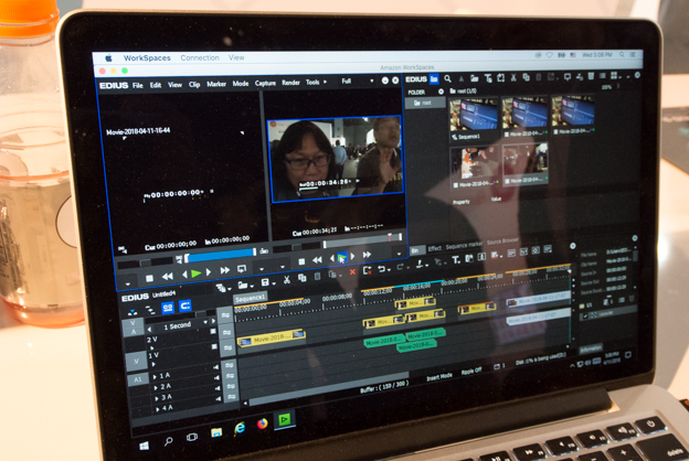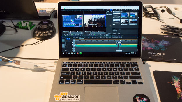 一番目を引いたのは、アマゾンウェブサービス(AWS)で動作するEDIUSのクラウドバージョンだ。ブースに展示されていたクライアントはMacBook Proの2015年版で、一見macOSでEDIUSが動作しているように見えるが、実際にはリモートデスクトップで動作している。実際に触ってみると、クラウドにもかかわらずディレイがなく、手元のPCにEDIUSをインストールした状態で使っているのと変わらないといった感じだ。リモートデスクトップで動作をするので、Androidでも操作は可能。しかも、ネットの帯域は、1Mもあれば動かすことができるという。