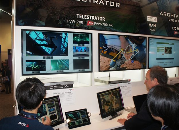 朋栄は本年も「FOR-A World of Possibilities(無限の可能性に向けて)」をテーマに掲げ、ライブプロダクションエリア、スタジオプロダクションエリア、カメラステージエリア、バーチャルセット活用エリア、IP/12G-SDIエリア、HDRソリューションエリア、ファイルベース/信号処理/富士通ソリューションエリアの7つのエリアに分け、撮影や映像制作、アーカイブなどに欠かせない各種製品やソリューションの展示を行った。