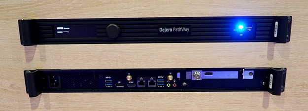HEVC対応エンコーダ/トランスミッタ「Dejero PathWay」。アダプティブビットレートに対応する1Uラックマウント筐体のエンコーダー/トランスミッターで、低遅延かつ優れた画質で確実に配信を行う。車載用途に最適なラックマウント型で、EthernetまたはWi-Fi、携帯接続をボンディングする