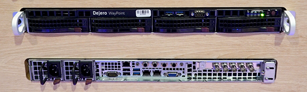 HEVC対応4チャネルサーバ「Dejero WayPoint」。トランスミッタからIPネットワークを介して転送されるビデオを再構成し、HEVCデコードしてSDIまたはIP(IP上でMPEG-TS)ワークフローへと出力する。1TB HDDを2指揮使用したRAIDシステム。ドライブはフロントパネルからホットスワップが可能。最大で4つの異なるソースから受信可能