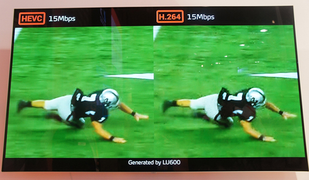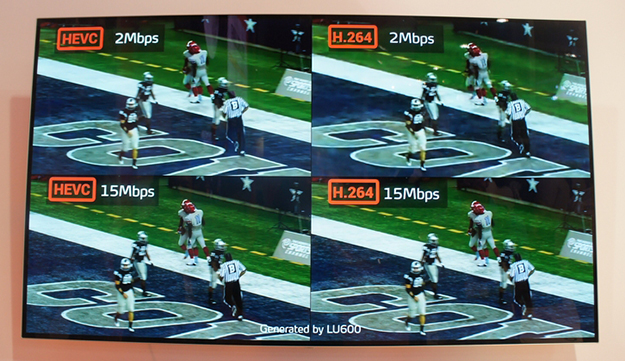 2Mbpsと15MbpsにおけるHEVCとH.264コーデックによる画質比較。低レートでも高画質を維持