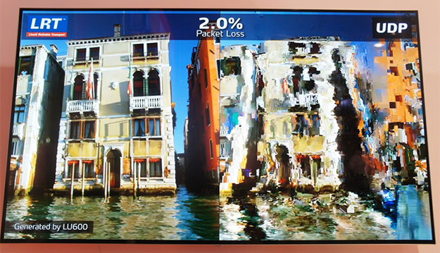 パケットロス2.0%における比較。LiveU Reliable Transportプロトコルの統合適応ビットレートと送信エラー修正テクノロジーによりパケットロス時の画質破壊を最小限になっている