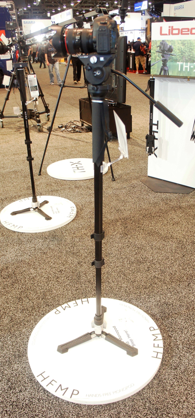スマートクイックリリースアダプターAP-Xは、同社のハンドフリーモノポッドHFMPやALXスライダーなどでカメラの着脱をワンタッチで行うのに便利なアクセサリー。取り付けは通常の三脚ネジに対応しているため同社以外の、例えばジンバルなどで利用することもできる。ブースでは、スマートクイックリリースアダプターAP-X単体のほか、AP-Xと自立式一脚HFMPをセットにしたHFMP AP KITなどを出展していた。