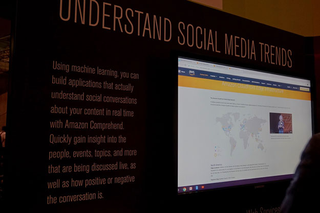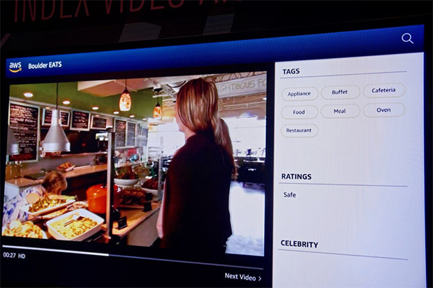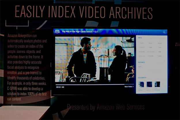 今年のNABの傾向として、一気にAIやマシンラーニングが表舞台に上がってきた感がある。これは数年前からの社会全般の傾向であるが、映像・放送業界にも広がってきた。この領域で中心にいるのはAmazon AWSである。NABではAWSが提供しているさまざまな画像や言語の認識や解析のサービスを、AWS自身はもちろん、様々なパートナーがデモしていた。セントラルホールのメイン通路では、AWSは3つのデモを行った。