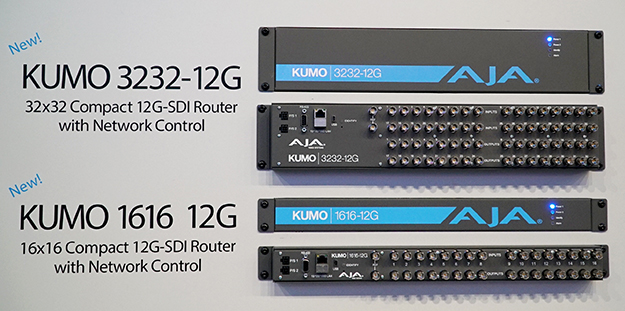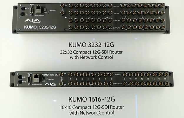 12G-SDI対応ルーターKUMO。32入力と出力のKUMO 3232-12G、16入力と16出力のKUMO 1616-12G、2機種でマルチポート・ギャング(複数ポートを連動した)ルーティングにより、8Kに対応することも可能