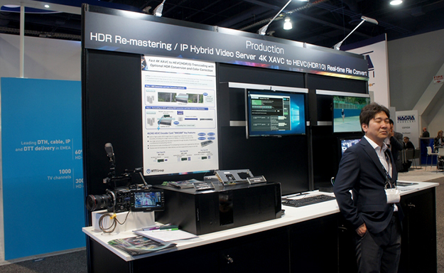 NTTグループは、HDRリマスタリングソリューションとしてIPハイブリッドビデオサーバー利用することにより4K XAVCからHEVC(HDR10)へのリアルタイムファイルコンバートのシステムを披露した。viaPlatzサーバーに4K/HD HEVCエンコーダーボードRM1000を装着することでリアルタイム化を実現している。