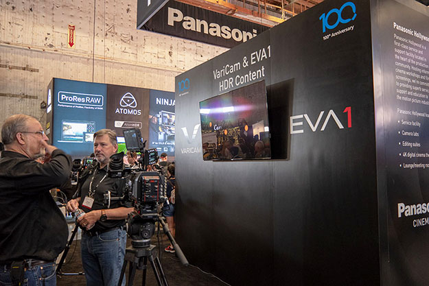 定番のPanasonicブースからご案内したい。スタジオ屋内に設置されたPanasonicブースでは、定番のシネマカメラVARICAMシリーズの他、ミドルクラスカメラEVA1を展示し、大いに盛り上がっていた。