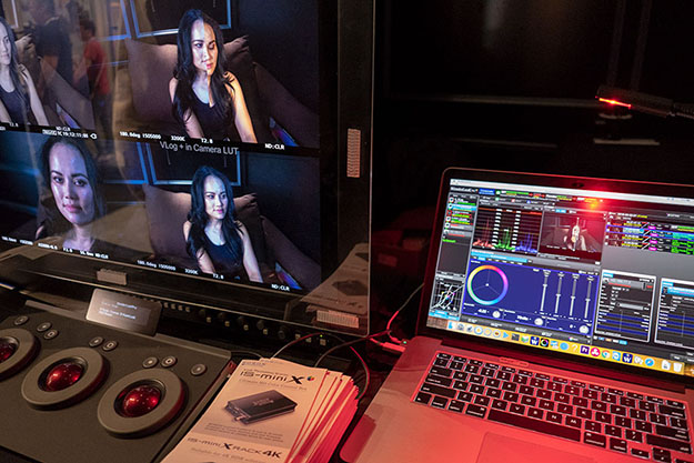 なかでも筆者の注目点は、暗室で行われていたWOWOWのWonderLookProのオンセットグレーディング実演展示だ。WonderLookProを同じくWOWOW製のIS-miniXと組み合わせれば、リアルタイムで様々な種類のカメラから同時にオンセットグレーディングが可能となる。
