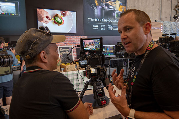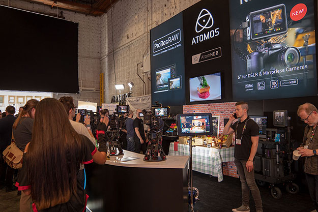 ATOMOSブースはPanasonicブースの隣に置かれ、EVA1などの外部収録におけるその連携を強くアピールしていた。各カメラにSHOGUN INFERNOなどの収録機を繋ぐ定番の撮影方法だけで無く、ケーブルを伸ばして大型収録機のSUMO 19をスタッフモニター兼で使うワークフローは映画と非常に相性が良く、NABから対応を開始したProPesRAWと合わせて、大いに注目を集めていた。