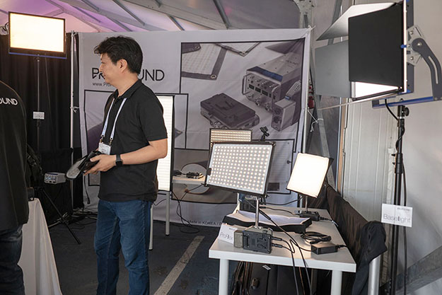 今回のCine Gearでも照明の進化は止まらず、PROFOUND製のProFlex LED照明は、その最先端を行く。大変に柔らかい同社製のProFlexは、一見ペラペラの紙だ。しかし、なんと、踏んでその上を飛び跳ねても破損せずに点灯を続ける。ぐしゃぐしゃに丸めてポケットに入れて運んでも何ら問題無く、おまけに薄型なので非常に軽い。ぐしゃぐしゃの形状のままでの点灯も可能だ。