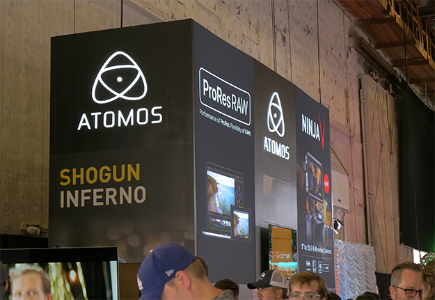 ATOMOSブースではProRes RAW推し。PXW-FS5やEVA1などのRAW出力をProRes RAW収録する展示が注目を集めていた。EVA1に取り付けられたSHOGUN INFERNOの5.7Kの表示を見て質問する来場者に、ブースの担当者が忙しなく応対していた。