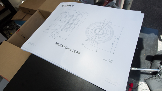 SIGMAブース:レンズの展示のほかに14mm T2 FFの設計図面を配布