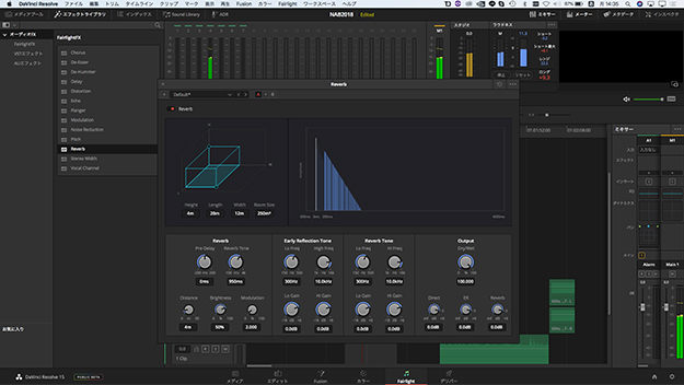 Fairlightに関しては、FairlightFXと呼ばれる標準搭載のエフェクトが無償版にも搭載されるようになりました。これまでもVSTプラグインやAUエフェクトには対応していましたが、ユーザーがプラグインを用意してインストールしないと使えませんでした。DaVinci Resolve 15からは、14種類のFairlightFXが最初から搭載されていまして、これらのプラグインは無償版でも使うことができます。