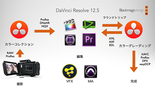 DaVinci Resolve 12.5の頃のワークフロー。他の編集ソフトを使う場合は、コンフォームやレンダリングなどに手間がかかる
