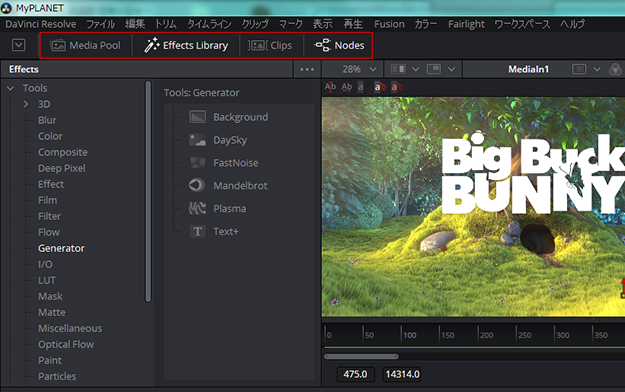 “Media Pool”、”Effects Library”、”Clips”、”Nodes”と書かれた部分は個々のウィンドウを表示するためのスイッチ。現在はEffects LibraryとNodesが選択されているので、それらが表示されている。