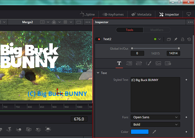 右端の”Inspector”、”Text2″と書かれた部分には、現在選択中のツールのコントロール類が表示される。コントロールは実に多くのパラメータを持っており、これらを全て(トグルスイッチでさえも)キーフレームアニメーションできるのも、Fusionの特長だ。