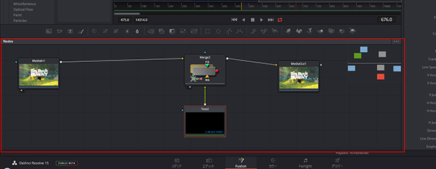 そして画面下半分にあるNodesが、実際に映像をコンポジット操作するためのノードビューだ。