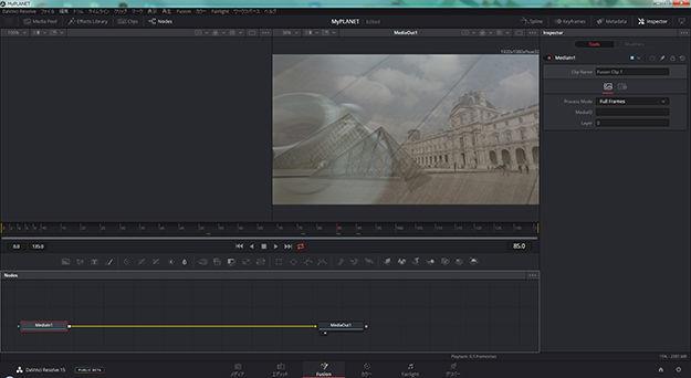 DaVinci+Fusionを使ったことがない方に説明しておくと、画面下部のノードビュー(MediaIn→MediaOutと表示された部分)は、Fusion単体ではデフォルトで何も出てこないが、DaVinci連携したFusionではDaVinci側のクリップが自動的に配置される(図06)。