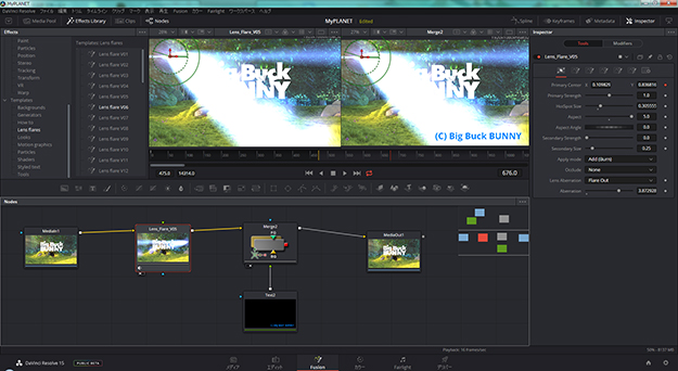 更にレンズフレアも適用してみよう。素材に被せるためには、どうしたらよいか。分かりやすいのはMediaInツールとMergeツールの間に、EffectsからTemplates-Lens flaresを挿入すればいい。MediaInを選択してからLens flares-LensFlare Vxxを選択すれば、自動的にMediaInとMergeの間に入ってくれる。すると、こんな感じのノードビューになる。
