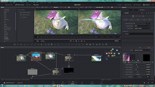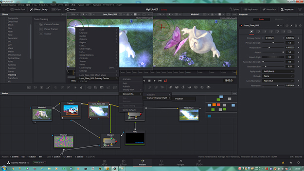 例えばTools-Trackingに属するTrackerを使って、Big Buck BUNNYの上を飛ぶ蝶の軌跡をトラッキングさせよう(今回Trackerの使い方は省く)。トラッキングの軌跡に合うようにレンズフレアを移動させたい場合は、レンズフレアのセンターを右クリックし、Lens_Flare_Vxx:Primary CenterをTrackerPath-CenterにConnect Toする。