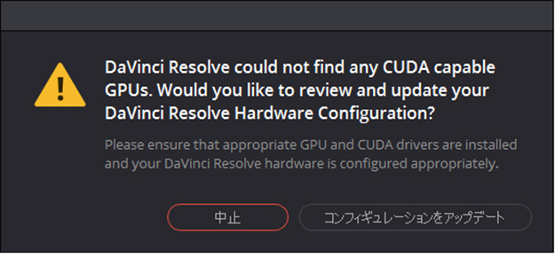 これに対してDaVinci Resolve 15は、CUDA3.0以上、OpenCL1.2以上あるいはMetal(macOSのみ)に対応したGPUが必須。インストールは行われても、起動時に「CUDA/OpenCLが使えないぞ!」と苦情を言われる場合がある。