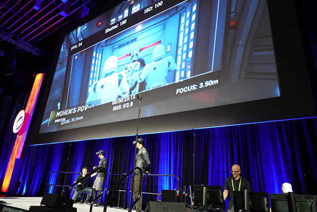 本デモンストレーションは、今年春のGDC(Game Developer Conference)2018でお披露目されたILMxLAB、NVIDIA、Epic共同の「スター・ウォーズ」のキャラクターを素材としたリアルタイムレイトレーシングのデモを、VR技術を活用したバーチャルスタジオ、バーチャルプロダクション、バーチャルカメラの撮影用技術としてその場でデモを行ったもの。デモプログラム等を担当したゲームメーカーのEpic Games社からはGavin Moran氏、特殊効果スタジオILMの研究部門であるILMxLABからはMohen Leo氏による発表が行われた。